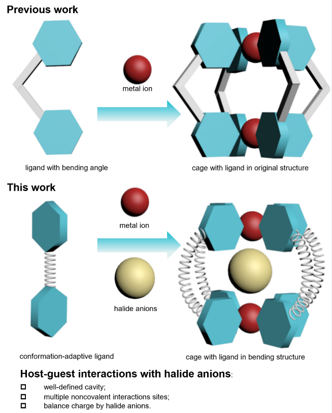 领域取得重要进展。课题组通过理性分子设计,利用具有构象自适应特性的二氢吩嗪配体与二价钯离子,成功构筑了一类对卤素离子以及BF4-和NO3-等阴离子具有极强结合能力的Pd2L4型超分子金属配位笼,并实现了配位笼对碳卤键的活化断裂。相关工作在线发表在91短视频
