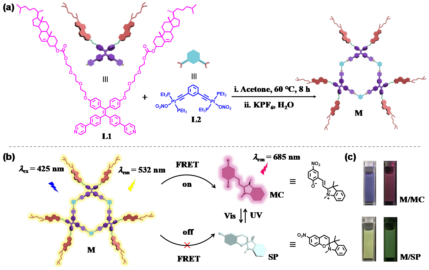 图1.(a)双功能化液晶金属有机大环M;(b)光响应荧光共振能量转移系统M/SP和M/MC;(c)M/SP和M/MC在紫外(右)和可见光(左)下的图片